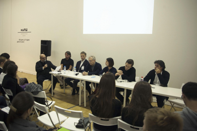 Оскар Мамлеев: – Видите, как трансформация человеческого организма может привести нас к формированию совершенно других городов. Мы начинаем нашу дискуссию, я приглашаю участников занять места. Мы рады вас приветствовать. Меня зовут Оскар Мамлеев, я профессор МАРХИ и школы МАРШ. В этом году я куратор спецпроекта «Исследование», на «территории» которого мы находимся. Я буду модератором сегодняшней дискуссии и представляю вам участников: Марко Михич-Ефтич – представитель Московского архитектурного института, он работает в МАРХИ в группе вместе с Юрием Григоряном. Всеволод Медведев – тоже преподаватель МАРХИ. Это группа – Михаил Канунников, Всеволод Медведев и Зураб Басария – три преподавателя, которые объединены практической работой в бюро «Четвертое измерение». Далия Сафиуллина – представитель Института «Стрелка». Константин Кияненко – доктор архитектуры, профессор Вологодского университета. Никита Токарев – директор МАРШ, и Ильнар Ахтямов – преподаватель Казанского университета. Для начала я познакомлю вас с мнением человека, который не смог быть на нашей дискуссии. Это Михаэль Айхнер – архитектор из Мюнхена, преподающий в МАРХИ и в МГСУ. Когда я узнал, что профессор Айхнер не сможет участвовать, я попросил его высказать несколько соображений на тему того, как он представляет себе перспективы архитектурного образования. Он выпускник Мюнхенского университета, преподавал и занимался архитектурной практикой в Германии, и несколько лет он имеет дело с образовательным процессом в российских институтах. «Несколько лет в России существует программа магистратуры в соответствии с Болонской системой. И главные архитектурные вузы страны ищут возможности для внедрения программы третьего стандарта. Для России появление этой новой программы является особенно ценным, так как оно стимулирует обновление старой устоявшейся системы высшего архитектурного образования. В данное время высшее архитектурное образование в России с большим количеством общих образовательных предметов без связи со специальностью больше тяготеет к школьному, чем к университетскому подходу. В современных европейских институтах программа обучения меняется в очень быстром темпе, чего не происходит в российских вузах». Михаэль Айхнер отметил три позиции. Первая – меньше ограничений, больше свободы. «Для успешного внедрения программы магистратуры в российских вузах необходимо изменение на разных уровнях. Главная цель – способствовать развитию науки, для чего необходимо обеспечить свободу действия и мышления преподавательского состава. Второе – выбор и взаимодействие. Важно предоставить студентам выбор программы, актуальных предметов и обеспечить взаимодействие с внеуниверситетскими специалистами и партнерами. И третье – открытость и привлекательность, готовность университетов к сотрудничеству с передовыми компаниями, привлечению современных специалистов, что ведет за собой достойное финансирование. Программы и магистратуры Болонской системы дают огромные возможности, представляя свободу в различных научных направлениях, и эта свобода, в свою очередь, должна использоваться и быть защищена.»