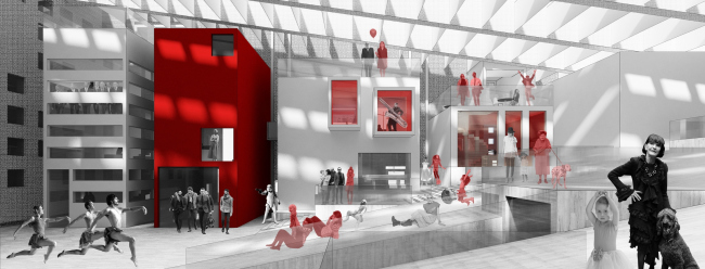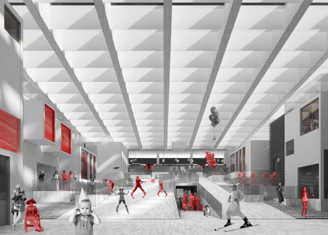 Функции предложены самые разнообразные: спорт, развлечения, магазины, медиа-центры. Все это размещается в существующем объеме в отдельных ячейках, выстроенных вокруг центрального ядра атриума с амфитеатром, и напоминает невысокую этажерку с выступающими полками-террасами. Любопытна идея расположить внутри здания бюро территориального развития, которое станет главной дискуссионной и рабочей площадкой для междисциплинарных команд по улучшению качества жизни и благоустройства Рязанского района.
