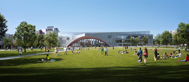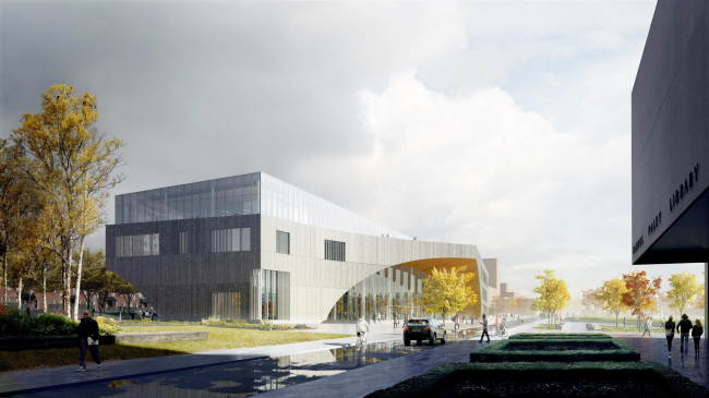 Снаружи здание будет облицовано камнем, что впишет его в контекст университетского городка. Входы будут выделены большими деревянными «арками» и остеклением. Также из дерева сделают обшивку атриума высотой в 3 этажа. Завершится он подобием свода с окулюсом, через который открываются перспективы на другие зоны библиотеки.