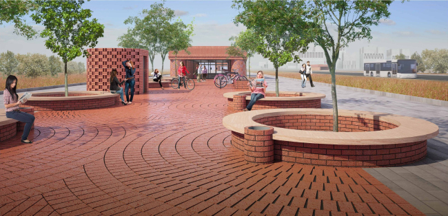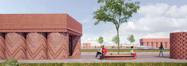 Преобладающий материал в этом проекте – кирпич, благодаря чему достигается единство стиля. Главное декоративное решение – вариативность кирпичной кладки. Этот прием позволяет отделить друг от друга функциональные зоны, а также расставить необходимые акценты. Территория вокруг павильонов решена в той же стилистике и благоустроена: здесь расположены места для отдыха, велопарковки, есть зеленые насаждения.