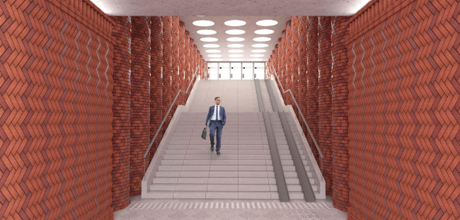Этот проект – светлый. Единственное затемненное пространство здесь – зона движения поездов. Линии плавно перетекают одна в другую, потолки становятся продолжением стен, большое количество арок и сводов создает ощущение торжественности и простора. Помимо стандартного набора функций, архитекторы предусмотрели общественные пространства: форум и амфитеатр, – которые станут местом для встреч и общения.