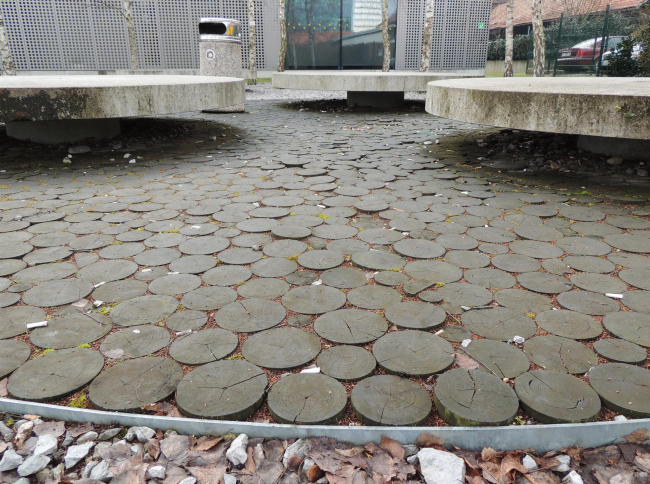 Благоустройство двора, как и в случае со студенческим общежитием, сочетает очень приятные текстуры и фактуры и отличается простотой, комфортом и изяществом решения.