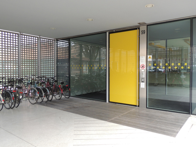 На фасаде использованы перфорированные складные элементы, напоминающие решение Situla: благодаря им можно регулировать «приватность» помещений: даже в закрытом состоянии через отверстия в панелях прекрасно видна улица, а вот снаружи не видно ничего. Большим плюсом является остекление части бокового фасада, благодаря чему все лестницы получили дневное освещение. Студенческое общежитие в районе Поляне © Елизавета Клепанова