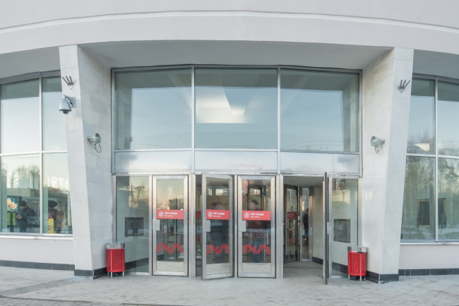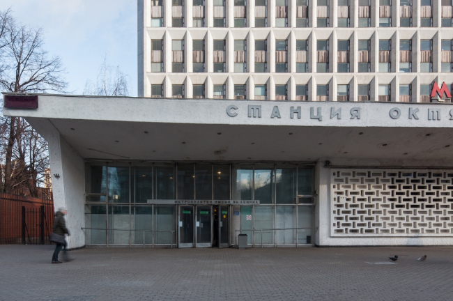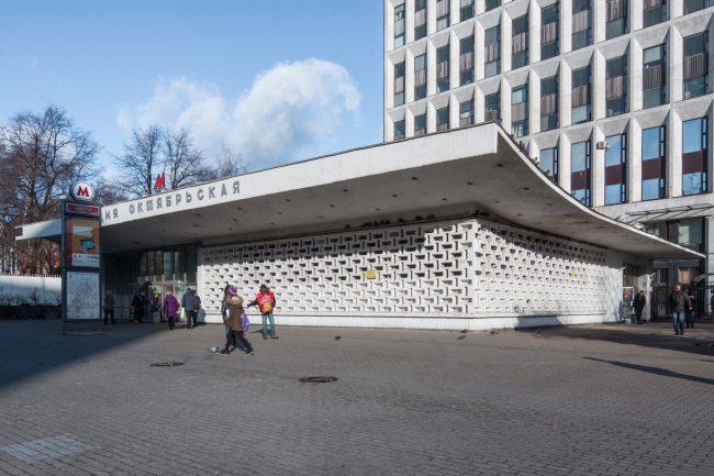 Ярким исключением в весьма скромную «хрущевскую» эпоху московского метро начала 1960-х стали вестибюли станций метро «Октябрьская» и «Ленинский проспект» Калужско-Рижской линии. Станция «Октябрьская», открытая в 1962, была запроектирована еще в начале 1950-х годов. Проект станции был существенно переработан архитекторами А. Стрелковым и Ю. Вдовиным в конце 1950-х. Тогда же пришлось и разработать проект стоящего отдельно вестибюля, т.к. будущую Октябрьскую площадь планировалось полностью реконструировать в духе новой архитектуры с крупномасштабными модернистскими постройками и новопостроенным кинотеатром, рядом с которым и должен был располагаться белоснежный вестибюль станции метро. Авторы мастерски совместили легкий изогнутый козырек, который оказывается внутри вестибюля куполом с точечными встроенными светильниками – с прямоугольными коробчатыми бетонными блоками, в которых скрыли остекление служебных помещений и камеры вентиляции.