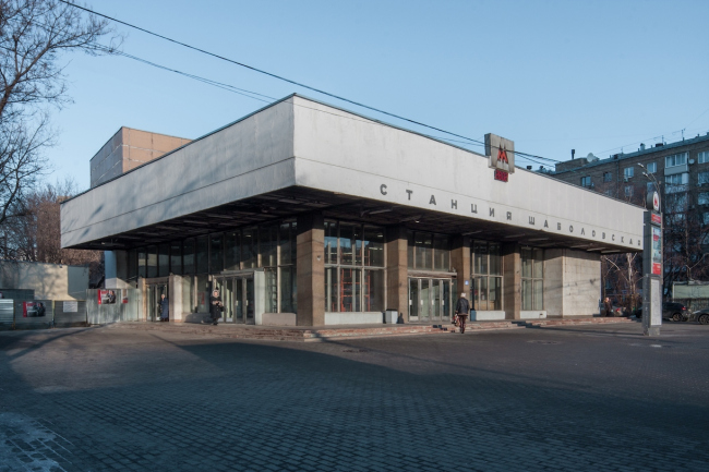 В этом духе была решена и архитектура вестибюля станции метро «Шаболовская», выстроенного в 1980 по проекту архитектора Н. Демчинского. Станция была заложена и построена еще в 1962, но из-за сложных геологических условий реализация была приостановлена. Первоначальный вестибюль планировался архитекторами А. Стрелковым и Ю. Вдовиным и напоминал по стилистике вестибюли станций «Ленинский проспект» и «Октябрьская», но в конце 1970-х годов проект оформления станции и архитектурная концепция наземного вестибюля были коренным образом переработаны в сторону монументальности. Согласно новому замыслу, массивное сооружение стало архитектурной доминантой площади перед улицей Шаболовка. В первом проекте присутствовали зенитные фонари в кровле, которые в итоге заменили на полусферы с искусственным освещением.»