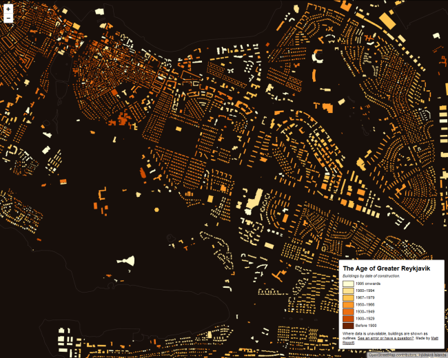 Карта Рейкьявика – одна из наиболее полных. Благодаря тому, что автор использовал сразу несколько открытых источников информации, удалось визуализировать данные о каждом доме столицы Исландии. Как и на других подобных картах о периоде строительства сообщает цвет: чем темнее цвет здания на карте, тем оно старше. Цветовая гамма карты Рейкьявика выглядит очень сдержанно. Предусмотрена возможность при наведении курсора на здание узнать его возраст и местоположение. Однако «отключать» отдельные строительные периоды нельзя.