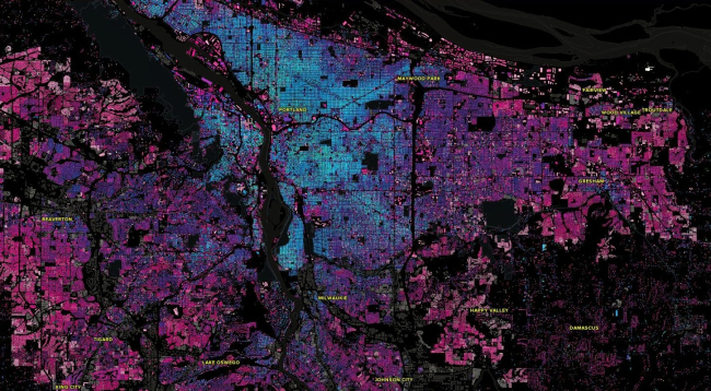 Интерактивную карту Портленда, города, расположенного в Орегоне, разработал молодой сотрудник компании GitHub Джастин Палмер. Он основывался на открытых архивных данных Портленда, где описано более полумиллиона городских построек, возведенных в разные периоды времени. 544 033 здания Палмер окрасил в определенные яркие цвета – так, чтобы можно было легко отследить, как старые кварталы сливаются с новыми. Здания, выкрашенные в цвет аквамарина, датируются 1890-ми годами, фиолетовые кварталы – 1950-ми, а ярко-розовая застройка начинается с 1970 года. Получилась красивая картинка, которая, между тем, позволяет анализировать структуру города. На карте, однако, отсутствует возможность отключить тот или иной период или узнать подробности об отдельном здании.