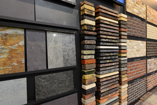 На выставке были представлены различные решения по облицовке фасадов и созданию уютных интерьеров, таких как норвежский камень, сланец и филлит («собрат» сланца, близкий к его «семейству» по фактуре и цвету). Среди наиболее интересных и эксклюзивных вариантов можно назвать цветной сланец от компании Cupa Pizarras (Испании), известняк (два уникальных варианта от английской компании Burlington Stone), а также упомянуть кварцит Alta Skifer (Норвегия), особенно разнообразие оттенков: серые крыши, красные фасады – это всё про него.