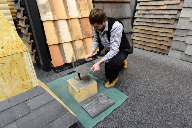 Пример такого исполнения в рамках выставки «Деревянный Дом» 2016 продемонстрировал специалист компании АРХИТАЙЛ Алексей Платухин. Мастер показал, как надо работать с кровельный сланцем, виртуозно постукивая молоточком и придавая плиткам правильную форму для укладки необычных кровель. При укладке использовались различные форматы сланцевой плитки нескольких цветов. Сланец укладывается в различных направлениях, что дает большие возможности для фантазии кровельщика.