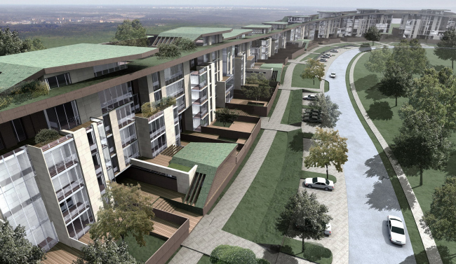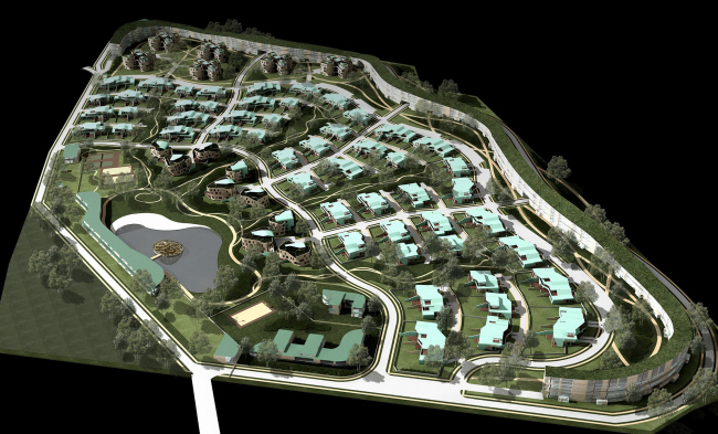 Внешний контур поселка образован очень длинным домом – его длина около полутора километров. Дом обозначает границу участка и защищает внутренний «амфитеатр» от внешней стихийной застройки, которой вокруг уже достаточно много. Дом прихотливо извивается, подражая ребристой поверхности раковины. Его первые этажи обустроены террасами для деревьев и цветников – здесь любое свободное место использовано для озеленения, даже если это пространство между верхними этажами. В зеленый парк превращена также и часть крыши.