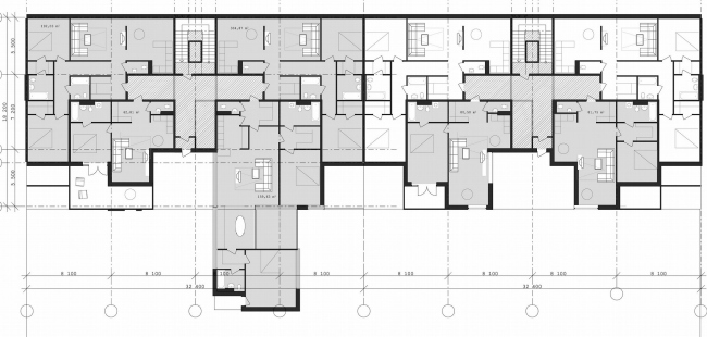 Следующий ряд – дома-четырехлистники, в каждом «лепестке» которых расположено по одной отдельной квартире на каждом этаже. В целом получается четыре объема, собранные вокруг расположенной в центре стеклянной шахты лифта – откуда в каждую квартиру ведет деревянный мостик. По словам Андрея Асадова, «типология представляет собой комбинацию частных домов и секционных башен, т.е. здесь несколько частных домов поставлены друг на друга».