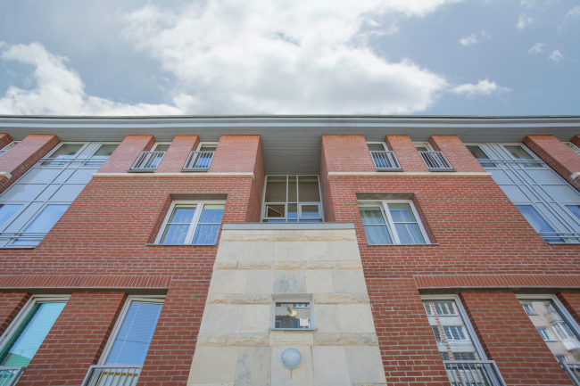 Архитектура комплекса реагирует на особенности окраины исторического Кронштадта. Прежде всего комплекс – невысокий, трёхэтажный с одним ярусом парковки, которая из-за сложной гидрологии на полтора метра выступает вверх из-под земли, отчего заслужила название «полуподземной». Три этажа, прежде всего, конечно, определены высотным регламентом охранных зон: они вторят высоте старых казарм и зданий Посадской улицы. Но посмею предположить, что «натянуть» высотность при желании здесь было бы несложно – поблизости как упомянутые пятиэтажки, так и сталинский, но похожий на поздний классицизм четырехэтажный дом офицерских семей. В соседнем дворе есть четырёхэтажные дома. Но Никита Явейн вернулся к масштабу николаевского фронта Посадской, «протянул» заданный там масштаб и тип застройки к западу, где рядом, пусть и за военным забором, море. А рядом с морем такие невысокие, протяженные кирпичные дома напоминают Голландию, где подобных, двух-трёхэтажных таунхаусов множество на окраинах городов. Словом, как будто бы следуя за мечтой Петра Великого, поклонника всего голландского от сапог до кораблей, здесь обозначился ещё один контекстный оттенок, историко-географический. Бог весть, превратится ли данный фрагмент морской крепости в «кусочек Голландии», но начало, прежде всего в отношении масштаба, будем считать, что положено.