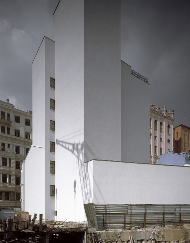 Спрашивать о том, какая форма красива, я полагаю, в этой ситуации бессмысленно. «Красота» – очень неясная категория. Если кто-то говорит, что он видел красивый дом, мне это не говорит ничего, я не могу представить себе этот дом. Но есть же некоторые, скажем, идеи относительно совершенной архитектурной формы. Пропорции, фактуры, композиция, массы. Стили. Пропорции и фактуры есть у любого живого существа. У дерева, у кошки, у слона. Это важно и для моего понимания архитектуры. Но у дерева, пожалуй, нет композиции, и распределение масс у него изменяется. И в эту сторону, по-моему, искать не нужно. Мне вообще не нравится архитектура, на которую что-то одевается. Нимейер правильно говорит, что здание уже должно быть полностью видно в бетоне. Это так же, как с живописью и графикой – мне больше всего нравится минималистичная графика, когда одной линией все сказано. Как у Пикассо или у Серова. Линия не должна обрастать штрихом. Здание не должно обрастать шерстью. Стили – это либо для критиков, либо для эпигонов. Это способ классификации, а не творчества. Заяц, он не знает, что он заяц, он просто есть. Так же должно рождаться здание. Человек, пытающийся построить сегодня конструктивистское здание – такой же стилизатор, как человек, сегодня делающий классическую архитектуру. Первоначальные, априорные образы формы могут быть только очень общими и примитивными – можно сказать, что вот здесь, на этом месте, может быть что-то большое, или длинное, или красненькое. А сказать, что здесь должен быть какой-то стиль – это насилие. Так даже думать нельзя. Потому, что этого стиля нельзя достичь? Потому, что его нельзя защитить. Он не выживет. Защитить перед кем? Перед всей совокупностью обстоятельств. Это нежизнеспособный зародыш. То есть здание может вырастать только из места и функции. Никогда – из истории искусства, из традиции, из абстрактного чувства красоты? Да, и это и есть критерий органичности архитектуры. Если архитектура органична – она красива. Административное здание на Страстном бульваре. Фрагмент фасадаФотография © Юрий Пальмин