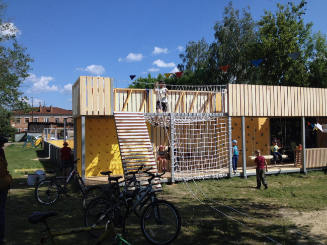Соседский центр (архитектурное бюро «Парк») построили на крыше над подвалами, устроенными жителями несколько лет назад. Место со сравнительно небольшим возвышением получило в народе название «Черный кортик» – здесь мальчишки тягаются так, чтобы, в конце концов, скинуть противника с наклонной крыши. Небезопасная игра: стены подвала подходят к дороге, по которой нередко автомобилисты срезают пробки. При этом здесь же пролегают самые популярные детские маршруты… Крыша стала «агорой» – комьюнити-центром двора.