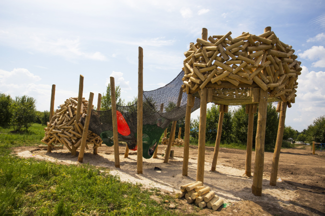 Посетители фестиваля также смогли оценить работы участников Летней школы «зеленой» архитектуры, которая проходила в эко-парке в конце июня: участники создали на территории парка восемь инсталляций, отражающих тему устойчивого развития.