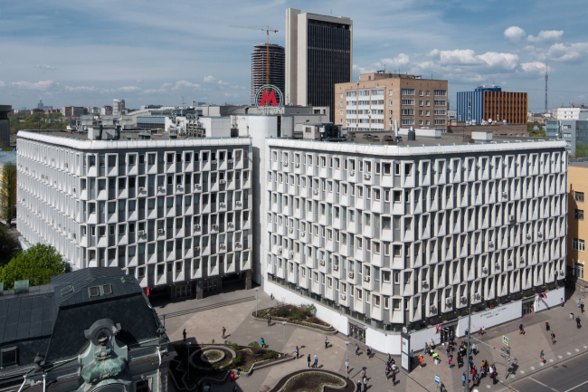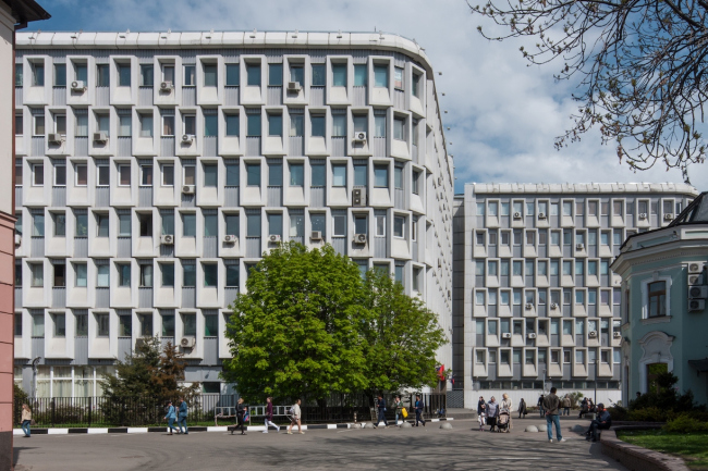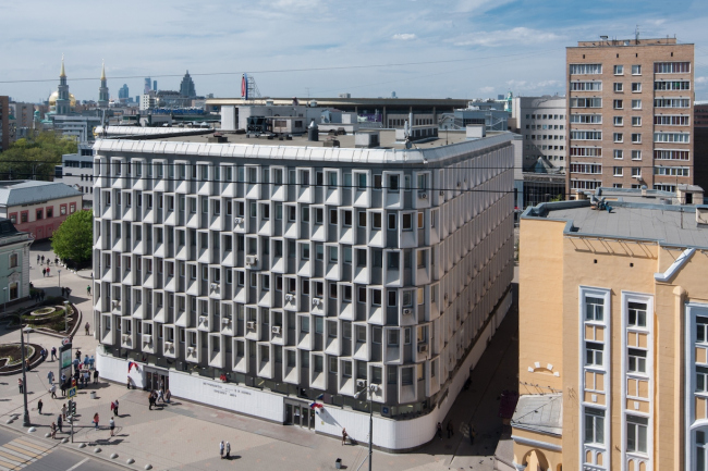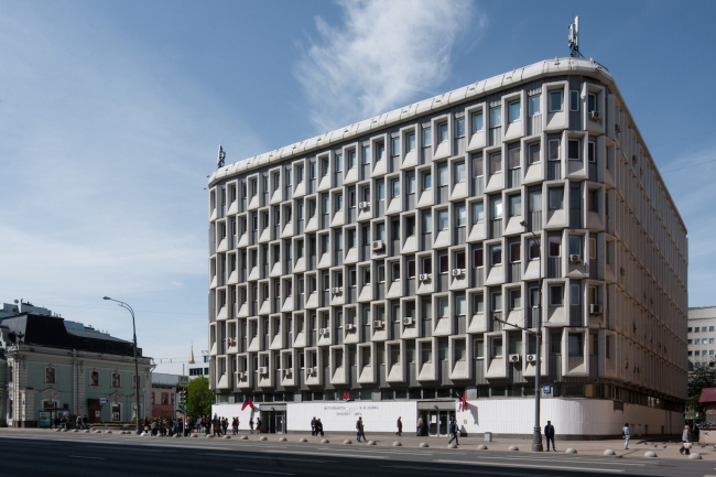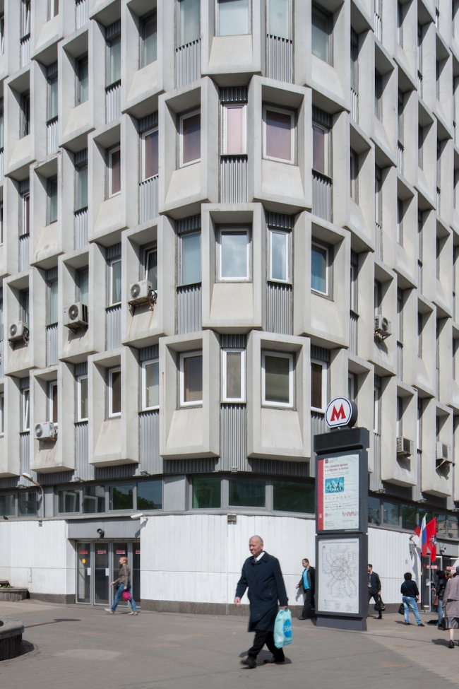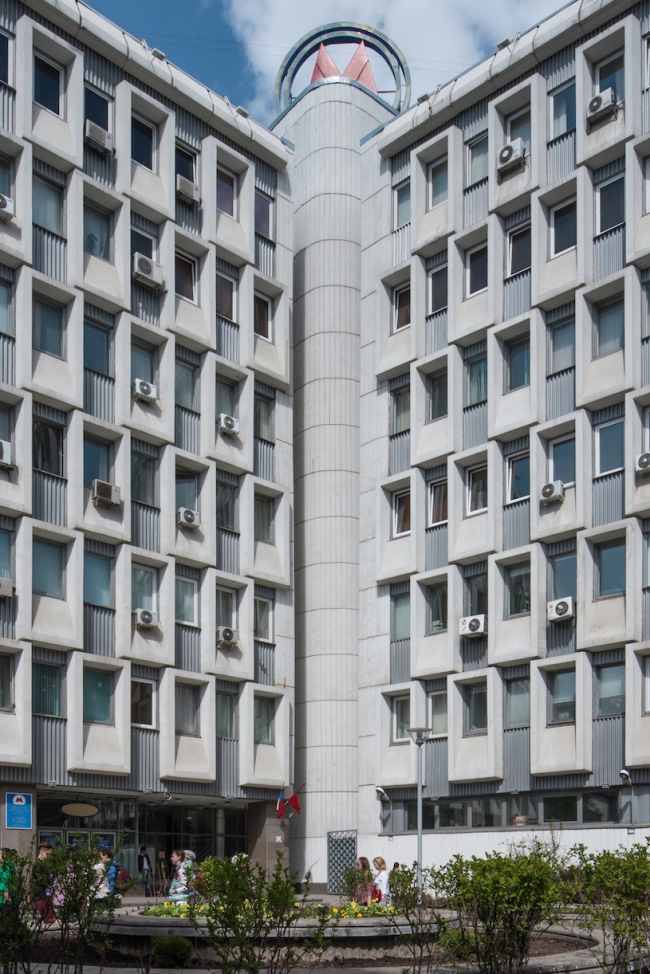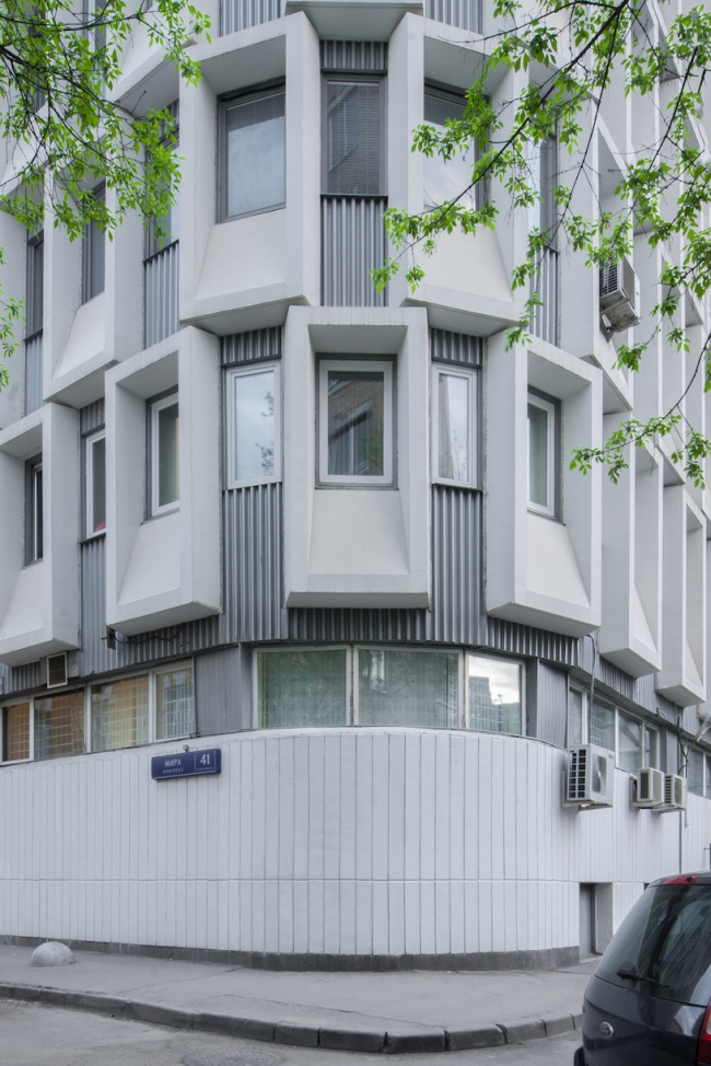 Архитектурные решения, изначально вызванные соображениями экономии – отделка металлическим профлистом, использование повторяющихся элементов – сегодня кажутся остроумными, интересными находками, придающими зданию особый технологичный облик. Облик, который уже прочно вжился в канву бурно шумящего ночью и днем проспекта Мира. Облик, который своей спокойной силой в сочетании с ритмом орнаментов окон надолго отпечатывается в сознании проходящих и проезжающих мимо.»