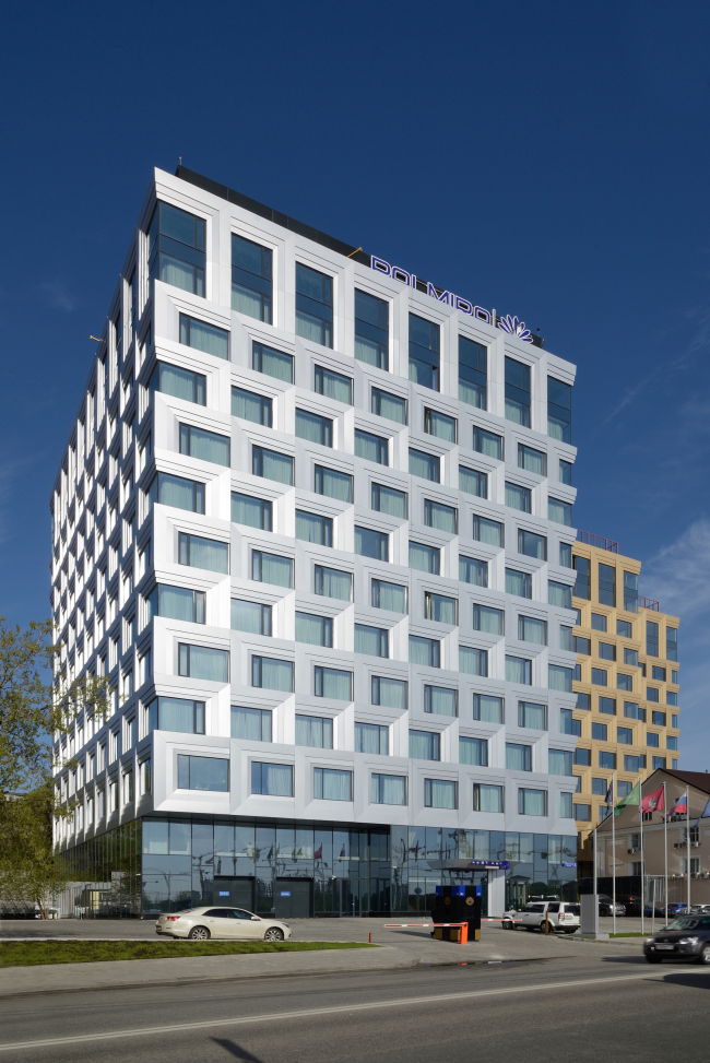 Тема орнамента всегда интересовала архитекторов SPEECH, и данном случае они как будто пустили по фасадам вертикальных меандровых змеек, серебряных и золотых. Они охватывают квадратные оконные проемы как небольшие «перспективные порталы», с которыми их сравнивают авторы проекта: каждая змейка кажется состоящей из трех слоев, который ступеньками отступает от стекла. Этот рельеф придает поверхностям стен фактурное, тактильное богатство, что эффектно оттеняется простотой силуэтов комплекса – хотя небольшой выступ из прямоугольного плана у каждого из корпусов создает дополнительные перспективные виды с «наложением» фасадов и их меандров друг на друга.