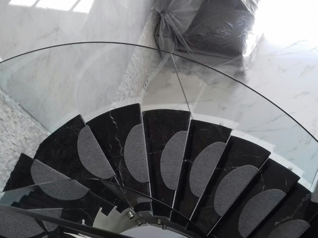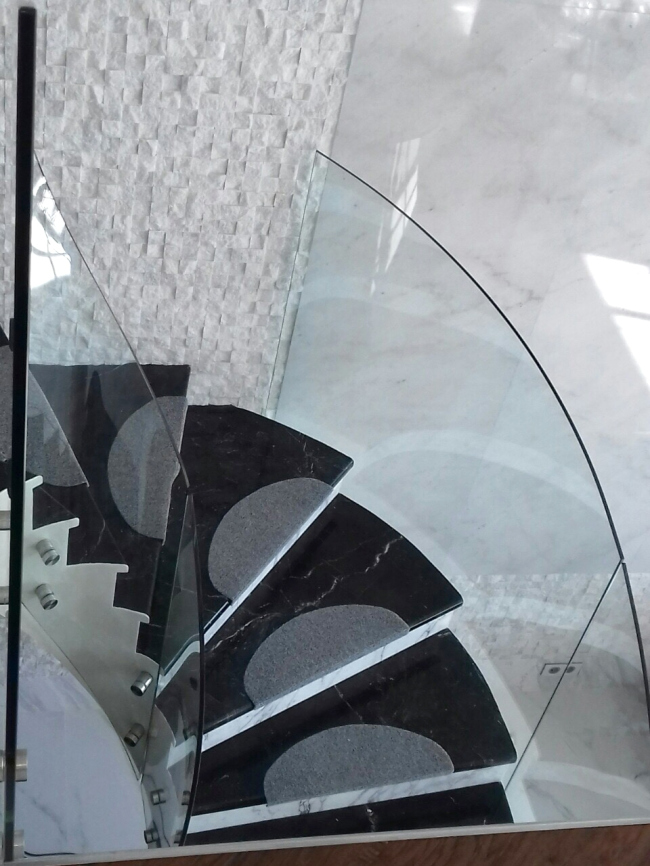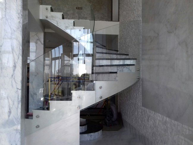Владелец обратился к специалистам Студии Архитектуры Подвижного Стекла ЮБК для осуществления проекта второго света и установки стеклянного ограждения F 40 на изогнутую лестницу, ставшую настоящей изюминкой внутреннего дизайна дома. Именно её сложная архитектурная форма привлекает к себе внимание гостей и владельцев дома и играет лейтмотив в холле коттеджа.