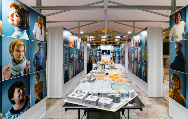 В центре зала находится крытый шатёр, внутри которого – небольшая «комната». В ней стол с рабочими макетами зданий. На стенах портреты сотрудников мастерской. Метафорически зритель оказывается, таким образом, в «сердце» творческого процесса, обсуждения проектов, «мозгового штурма». Портреты на стенах создают ощущение шумного собрания вокруг архитектурных макетов – вариантов будущих построек. На столе много знакомого: проекты жилых домов, гостиниц, общественных зданий. Процесс проектирования здесь представлен в самом простом, лёгком для понимания и ненавязчивом виде: можно рассмотреть, как замыслы воплощаются в небольших кусочках пеноплекса.