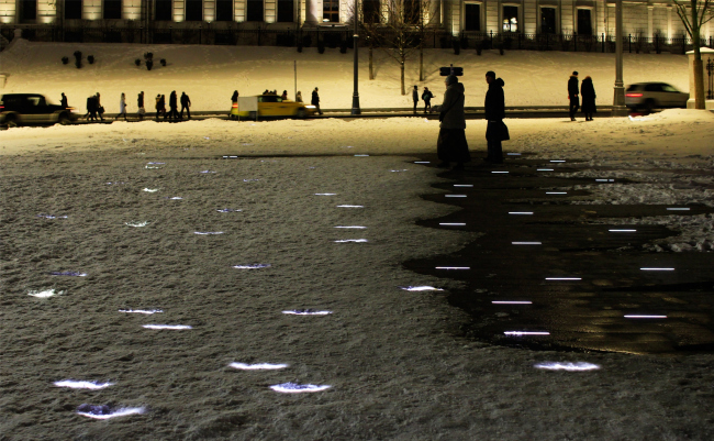 Так что – невозможно оторвать благоустройство от памятника, любая добросовестная работа, а она в случае с благоустройством, очевидно, добросовестная и креативная, должна в наше время не только учитывать, а и проживать контекст, пропускать его через себя, осмыслять и преобразовывать, реагировать. А уж такой контекст, который в самом центре площадки и для которого собственно делается благоустройство – уважающий себя архитектор вообще не может не учесть, это и не контекст даже, а сюжет, главная тема. Поэтому дистанцироваться – невозможно, хотя и слияния не происходит. Как уже было сказано, даже информационные потоки – один мощный, о памятнике, и другой слабый, о площади, – идут параллельно, причем с оговоркой: «можно сколько угодно спорить».