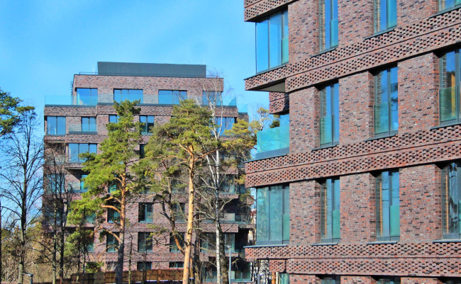 Современные здания вмещают квартиры с панорамным остеклением и открытыми террасами с видом на лес и воду. Для возведения несущих стен использовались керамические блоки Porotherm 25, для внутренних межкомнатных перегородок – Porotherm 12.