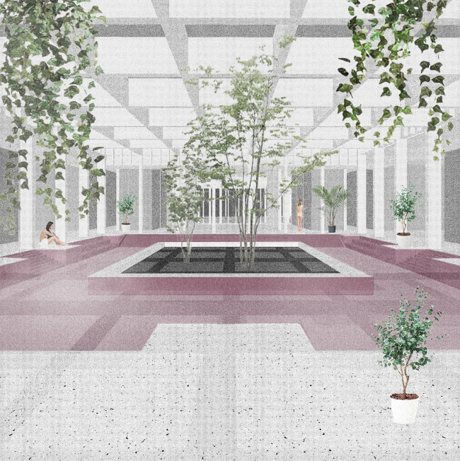 Проект – двухэтажное здание, состоящее из двух частей: открытого бассейна, обращенного к Москве-реке, и крытого бассейна/оранжереи. Оранжерея окружена шестью разными банями – русской, финской, ирландской, римской, турецкой и японской, и играет роль объединяющего центра. На первом этаже расположены детская и игровая комнаты, образовательный центр, лекционный зал и пространство коворкинга. В комплексе есть спа-центр и тренажерный зал. Два подземных этажа отданы под парковку. Бани в Сити. Внутренний двор. Дипломный проект Анастасии Калмыковой. Руководители: Александр Цимайло и Николай Ляшенко. 15 группа. МАРХИ, 2016