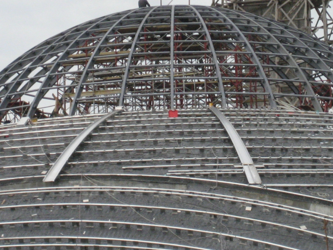 Классическую кровельную систему Kalzip® для установки по бетонному основанию в данном случае пришлось значительно переработать в связи с особенностями геометрии купола-паруса и сложностью архитектурных задач. Обычно алюминиевые профилированные листы Kalzip® крепятся к несущему основанию с помощью клипов-опор (зажимов). В данном случае по всей поверхности купола сначала установили алюминиевые трубы, гнутые по радиусу, на них прикрепили профилированные листы, которые защелкиваются в фальц (это и есть собственно кровельная система).
