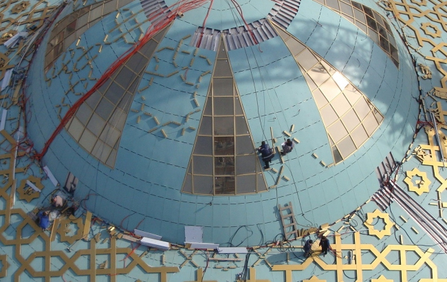 Установка золотистой звездчатой арабески – заключительный этап монтажа. Детали орнамента устанавливались на подставки-профили такого же золотистого оттенка, которые помимо всего прочего скрыли внутри себя кабели обогрева и модулей освещения. Последних в проекте предусмотрено огромное количество, поскольку свод мечети, днем меняющий свой цвет в зависимости от погоды от голубого до синего, ночью освещается 50 000 светодиодных ламп и 96 прожекторами, установленными на минаретах.