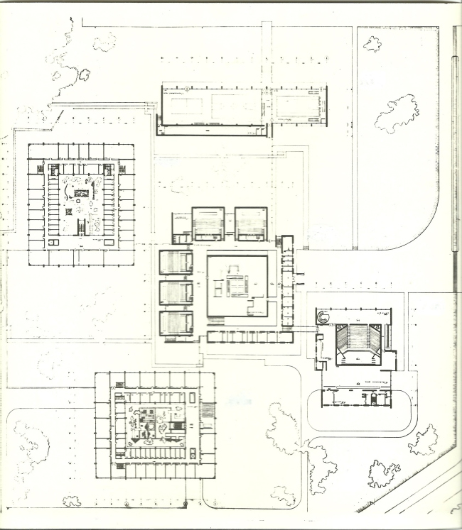 Живописный участок, расположенный напротив западного лабораторного корпуса Главного научного центра отличался рельефом, повышающимся по мере отступления от городского проезда к лесу, ограничивающему его с западной стороны и понижающемуся к северу, по мере приближения к пруду. В этих обстоятельствах предпочтительной представлялась свободная композиция малоэтажных зданий, контрастная соседним лабораторным зданиям – как по масштабу ее элементов и ритмическому строю, так и по материалам, характеризующим образ зданий.