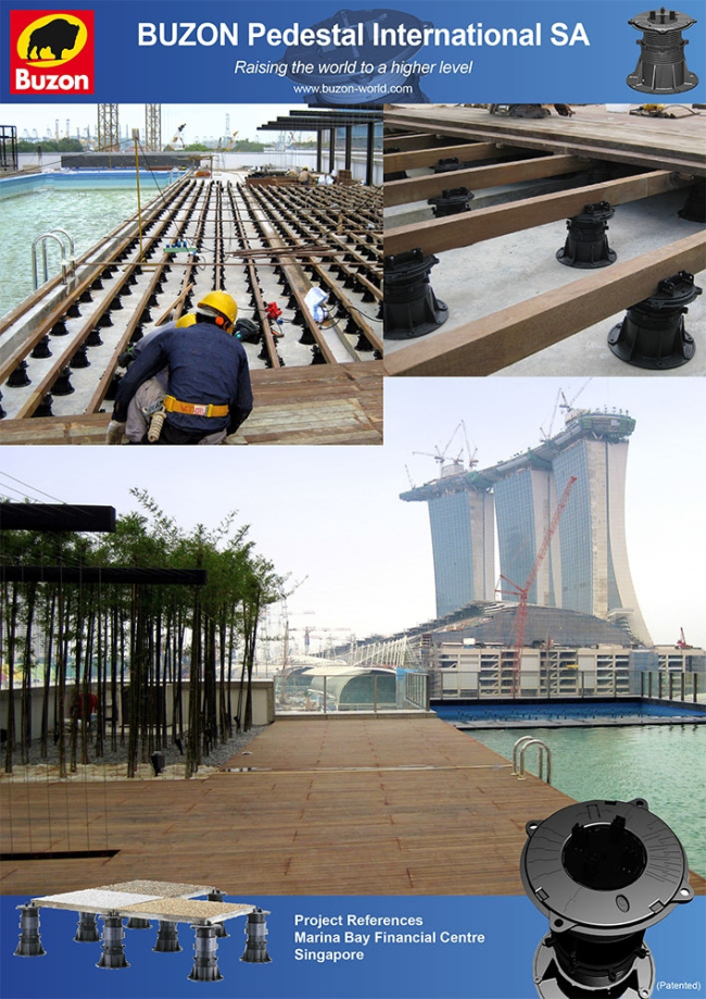 Системы регулируемых опор BUZON широко используются для устройства сухих комфортных полов не только на эксплуатируемых кровлях, но и вокруг бассейнов, а также при устройстве фонтанов, террас, пешеходных площадок, временных помостов для выставок или других мероприятий.