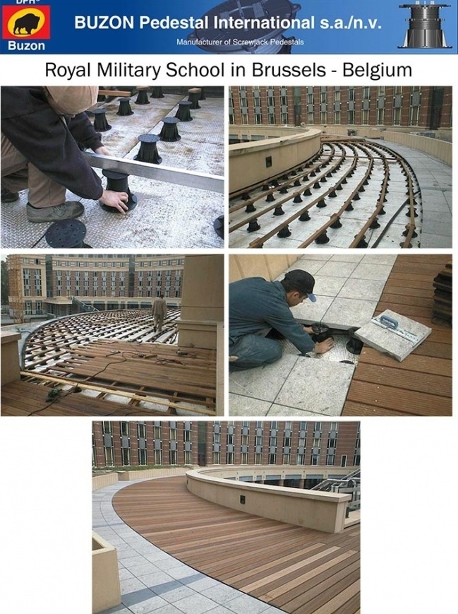 Бельгийская компания Buzon Pedestal International, созданная в 1987 г. и поставляющая продукцию в более чем 50 стран мира, является крупнейшим европейским производителем регулируемых винтовых опор. А несколько лет назад Buzon пришел в Россию и на строительных объектах начали устраивать террасы на регулируемых опорах, которые позволяют задать необходимую высоту покрытия, а также нужный уклон.