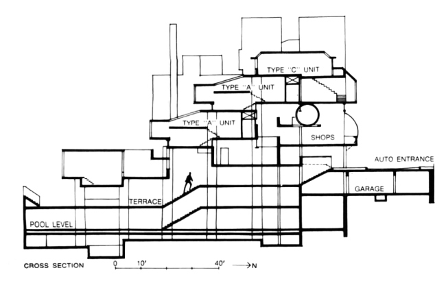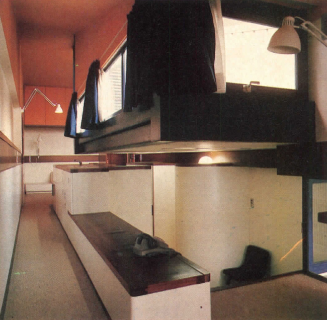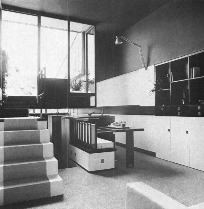 Нижние этажи, включая подземные, отведены под общественные функции: небольшие магазины (точнее, ларьки), ресторан, кафе, бар, кинозал, аудитория, плавательный бассейн, спортзал и пр. Верхние этажи – жилые, там располагаются квартиры / гостиничные номера, изначально предназначавшиеся для кратковременного проживания сотрудников «Оливетти» (всего их 55). Большая их часть выходит на юг, в небольшой сквер. Все жилые ячейки, независимо от размера, имеют оригинальную планировку: несколько уровней пола, встроенное оборудование и даже маленький дворик в центре; помещения интегрированы друг с другом, как на яхтах или в домах на колёсах. Каждая студия обозначена на фасаде металлическим кожухом-эркером; снаружи они напоминают корабли, пристыкованные к космической станции. «Восточная жилая единица» (Residenze Est) в Ивреа. Южный фасад © Василий Бабуров