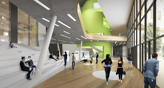 Объёмы-крылья, направленные в разные стороны, наслаиваются друг на друга, сцепляются в неожиданных ракурсах, захватывают экстерьер, размывают границы внешнего и внутреннего... Здесь, наконец, архитекторам ATRIUM удалось реализовать свой любимый творческий метод – взаимопроникновение сложных структур во весь рост четырехэтажного здания. Как следствие этих взаимодействий и «тектонических сдвигов» – система координат смещается, коридоры из прямых транзитных путей трансформируются в многофункциональные общественные пространства, а кульминация – центральный атриум-холл. Сюда ведут все дороги и активности, лестница-амфитеатр – неизменное место встреч. Это универсальная точка схода в архитектурно-объемном и социально-функциональном смысле.