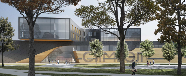 Главным входом и прозрачным вестибюлем школа обращена к центральному бульвару, окнами-витринами раскрываются на него и два верхних консольных «луча». Сюда ориентированы функции, которыми смогут пользоваться все жители района – библиотека, спортивный и зрительный залы. Библиотека-медиатека задумывается как полноценный районный клуб, где будет удобно проводить кинопоказы, лекции, встречи литературных кружков. Площадь перед ней – продолжение выставочной зоны парка: в хорошую погоду все ее активности могут переместится на открытый воздух. Да и занятия с детьми можно проводить на улице: в школьных дворах для этого есть все необходимое.