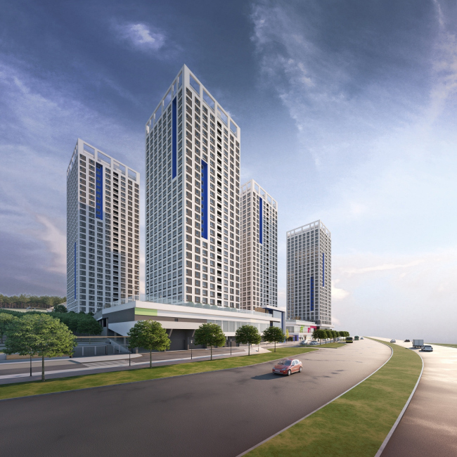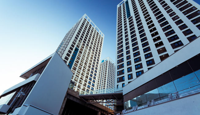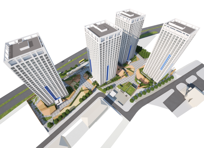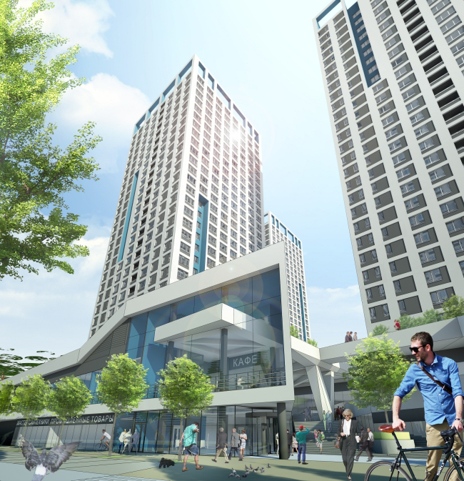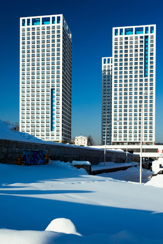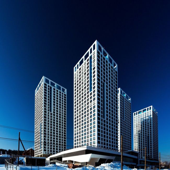 Жилой комплекс состоит из четырех 26-этажных башен. Для того, чтобы визуально облегчить такой объем, архитекторы спроектировали по периметру кровли высокие рамы, в проемы которых можно увидеть небо. Этот прием поддержали, решив в голубом цвете и верхний технический этаж. Ритм фасада создают вертикальные «вдавленные» полосы, узкие и предельно лаконичные. Высота их расположения чередуется от корпуса к корпусу.