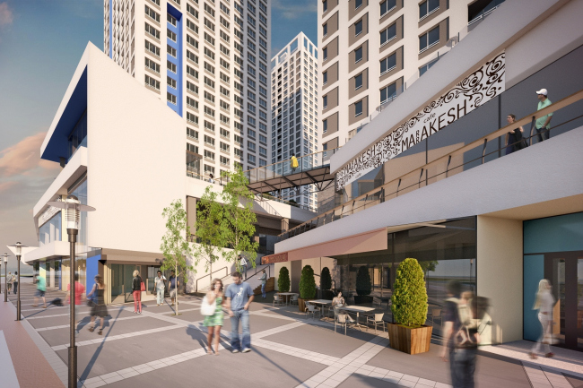 На стилобате расположены два двора с детскими площадками, палисадники, приподнятые над уровнем тротуара благодаря подпорной стене, прогулочная зона-палуба с видом на пруд, а также «пьяцца» и амфитеатр.