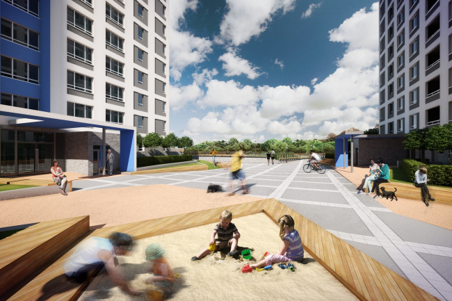 Много внимания «ОСА» уделили благоустройству. «Дворовое пространство максимально комфортно и разнообразно. Оно разделено на характерные пространственные архетипы. Это позволило осмыслить достаточно большую и сложной формы территорию комплекса и добиться ощущения комфорта и человеческого масштаба», – объясняют архитекторы.