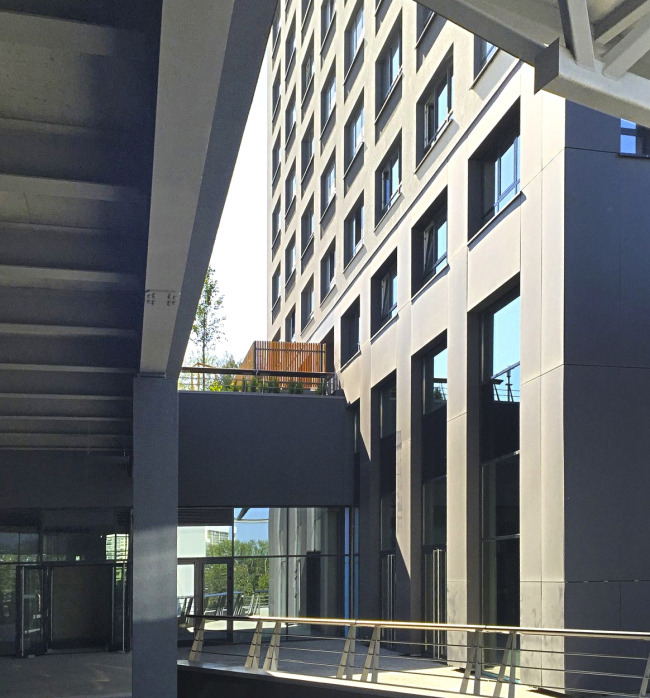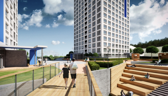 Дома поставили на стилобат из четырех уровней с лестницей посередине, которую в бюро прозвали «каньоном». По ней прохожие могут выйти из лесопарка на стилобат и, минуя придомовые территории, беспрепятственно спуститься к остановке.