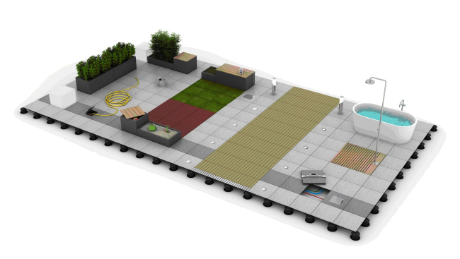 Система позволяет, при необходимости, комбинировать различные виды внешнего покрытия, в соответствии с пожеланиями заказчика. Особенности монтажа дают возможность производить работы в сжатые сроки и создавать практически любую конфигурацию зоны в одном или нескольких уровнях. Регулируемые опоры Buzon соединяют отдельные элементы покрытия между собой так, что не требуется какого-либо дополнительного крепления плитки к поверхности основания, на которое она уложена.