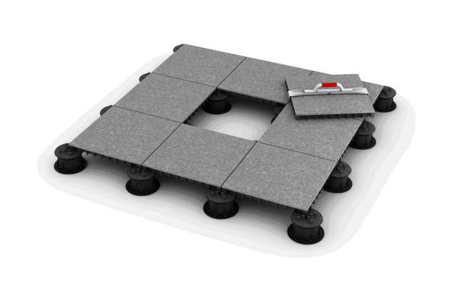 Вода, попадая на террасное покрытие, свободно стекает сквозь межплиточное пространство вниз до гидроизоляционного слоя и затем удаляется с кровли через воронки. Свободное пространство обеспечивает циркуляцию воздуха под террасным покрытием, что способствует высыханию поверхности гидроизоляционного слоя и, соответственно, увеличению его срока эксплуатации.