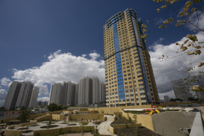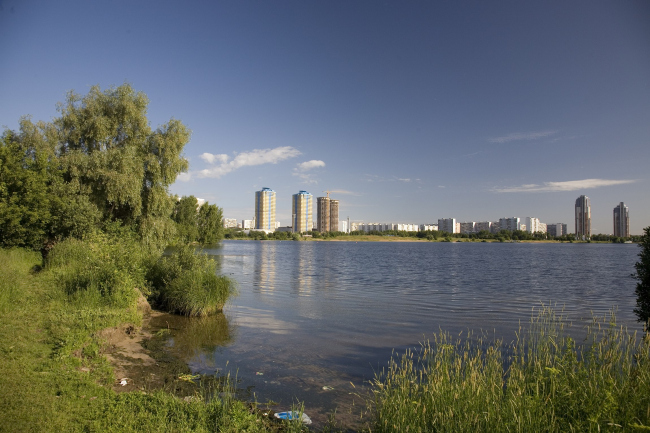 Мы уже писали о проекте комплекса «Янтарный город». Он был отмечен несколькими дипломами, в том числе и на «Зодчестве» 2004 года. Наиболее оригинальный ход этого проекта – многоярусные атриумы внутри двух башен (как раз тех, которые уже построены). Атриумы разделены на части – по четыре этажа в каждой. Получается снаружи – башня, а внутри – вроде бы невысокий город. Только ячейки этого города поставлены не рядом вдоль улицы, а друг на друга. Дома поставлены вдоль линии Таллиннской улицы, атриумы ориентированы почти что на север, а квартиры располагают замечательными видами на разные части Строгинской поймы. Сейчас в Москве проектируется множество больших домов с разнообразнейшими атриумами и висячими садами, но «Янтарный город» был одним из первых примеров московских поисков на эту тему.