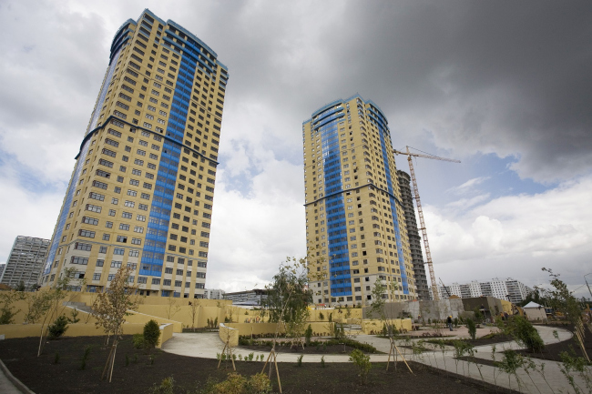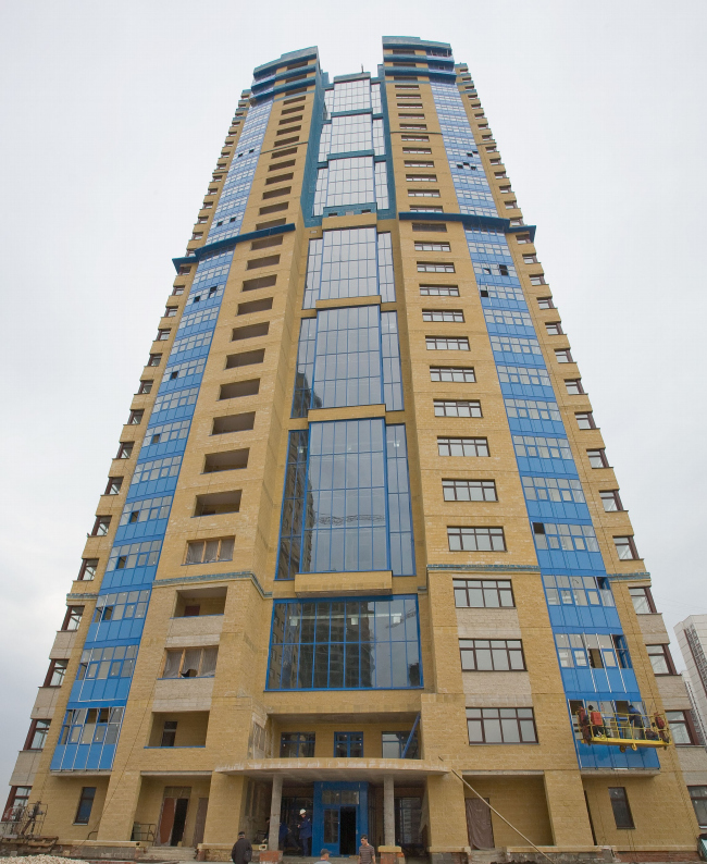 Снаружи башни тоже получились не совсем обычными. Из-за атриумов они широкие, хотя и не приземистые – спокойные такие крупные башни. Но это не главное. Основной пафос этих домов, как кажется – в облагораживании, а может быть, даже в некоторой степени преодолении жанра элитных башен, в Москве набившего страшнейшую оскомину. Характерный пример жанра – комплекс «Алые паруса», стоящий на противоположной стороне реки. Так вот, «Янтарный город» Дмитрия Александрова всячески отрицает этот жанр в его московской интерпретации.