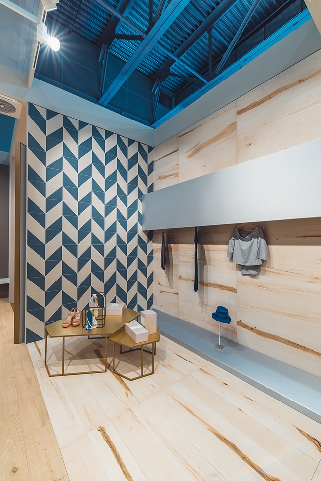 Отдельное пространство – торговый бутик, оформленный настенной плиткой, имитирующей шелковую поверхность, и керамогранитом с фактурой «под дерево» 2017.
