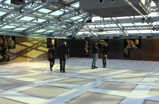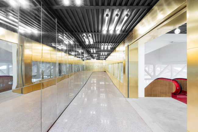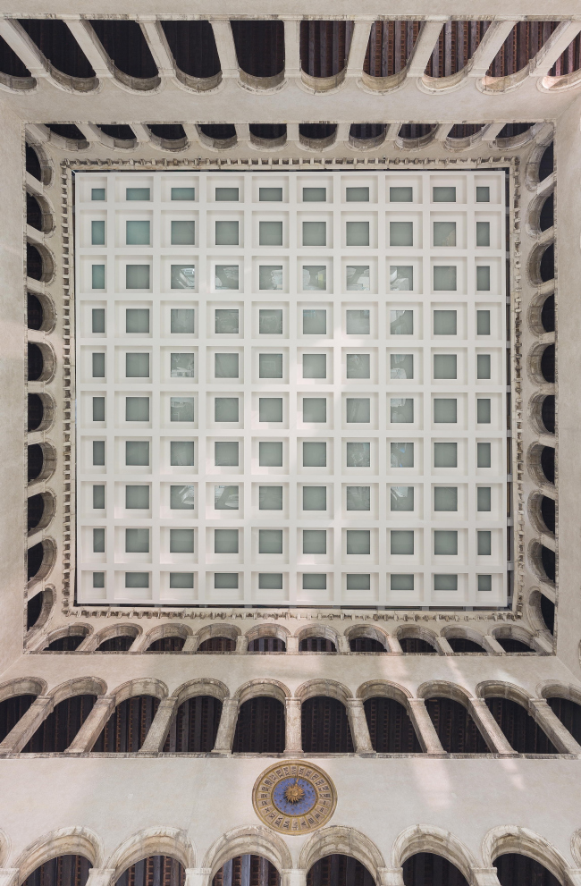 Нужно отметить использование при реконструкции традиционных материалов – но инновационными способами. К примеру, ограждения галерейных пространств Фондако из железа сочетают дизайн ОМА с работой местных мастеров, а истрийский камень вместе с мрамором Rosso di Verona складываются в переосмысленный красно-белый венецианский орнамент на полу внутреннего двора. Чаще всего в проекте встречается латунь: этот металл многократно предстает как в своем естественном состоянии, так и превращенный в красочный градиент посредством специального процесса окисления – от кобальтового синего до светло-золотистого.