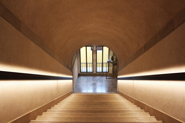 Важным элементом реконструкции Фондако стало создание в здании вертикальных связей. Теперь в нем появились ярко-красные эскалаторы, декорированные деревом и латунью. Со стороны Калле-дель-Фонтего центральное помещение занимает новая лестница, которая была реализована как вставка в здание. Она – образцовый пример аккуратной работы с наследием: это стальная конструкция, прикрепленная к новой бетонной стене, которая, в свою очередь, не соприкасается с существующими историческими стенами. Таким образом оригинальная структура Фондако становится видимой. Для облицовки балюстрады лестницы использовалась латунь в естественном и окисленном состоянии. Впрочем, историческую структуру здания видно еще и в лифте с стеклянной стеной и потолком: во время его движения между этажами можно посмотреть на каменную кладку Фондако-деи-Тедески.