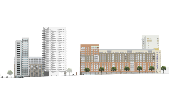 Башня: Башня визуально разделена на две тонкие пластины. Это помогает сделать ее пропорции более стройными, а также раскрыть центральный коридор, чтобы привнести туда дневной свет и визуально связать его с улицей. В темное время суток «разрез» будет светиться изнутри, придавая зданию запоминающийся облик. Пластины башни смещаются по горизонтали и вертикали, акцентируя вход на уровне земли и создавая террасы для верхних квартир пентхауса. Южный фасад приобретает глубину: большие «французские» балконы раскрываются в сторону захватывающего дух вида на реку.