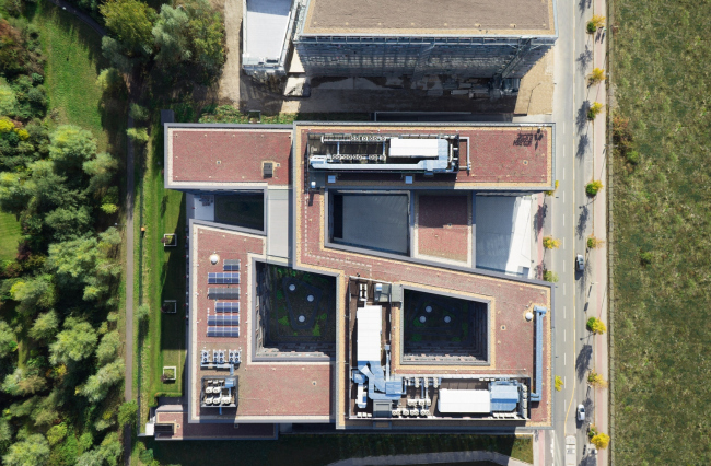 Общая площадь озеленения – почти 4500 кв. м. Помимо ландшафтных садов, были созданы живые крыши из седумов на фактической кровле здания.