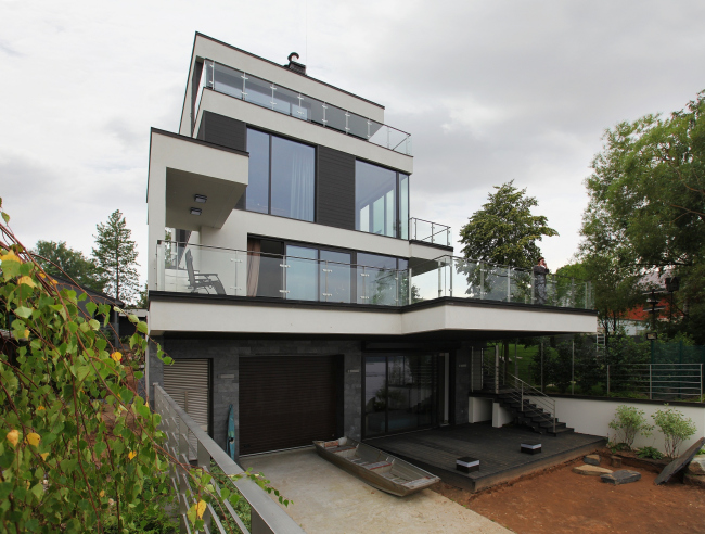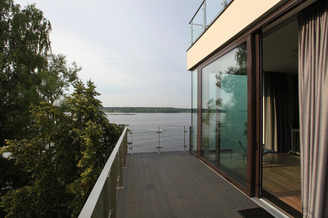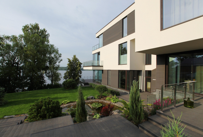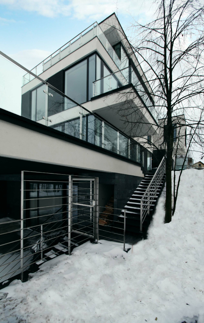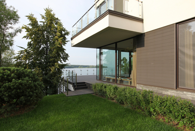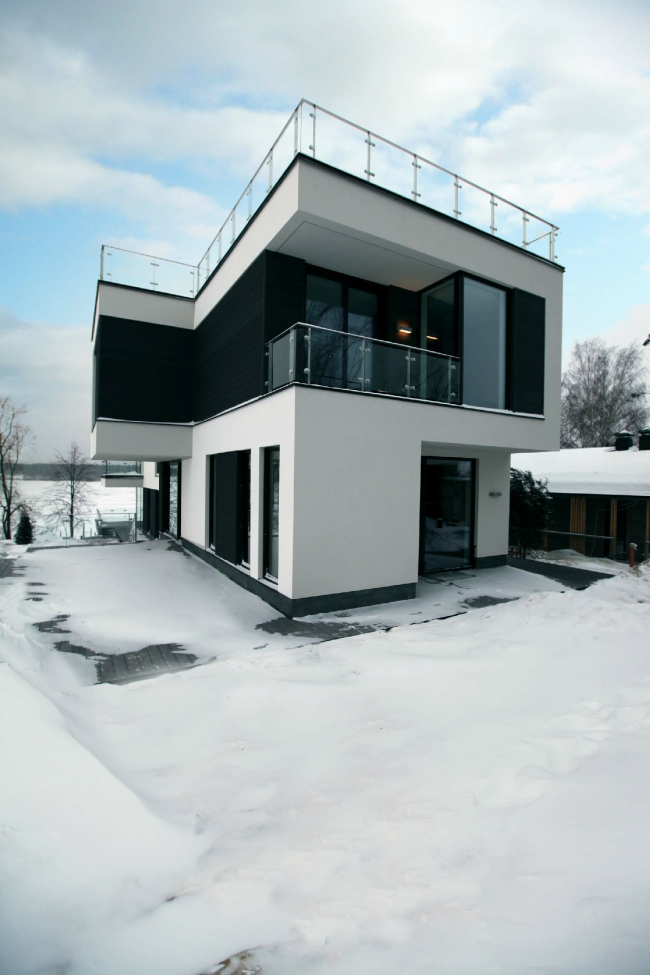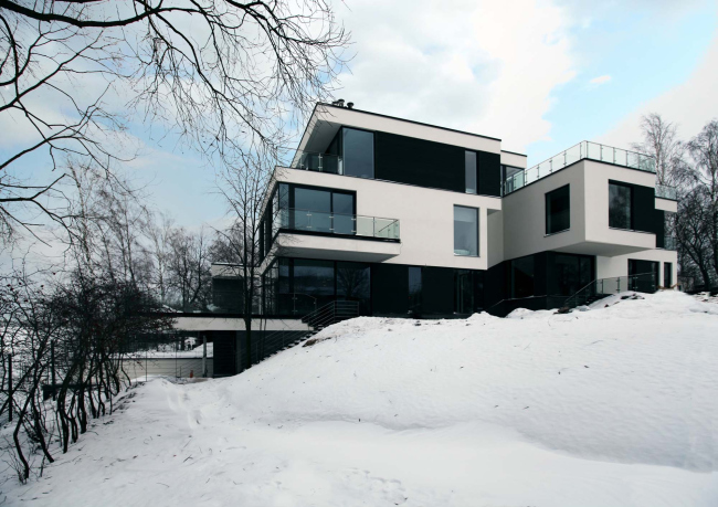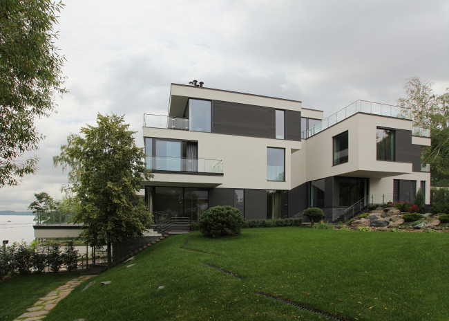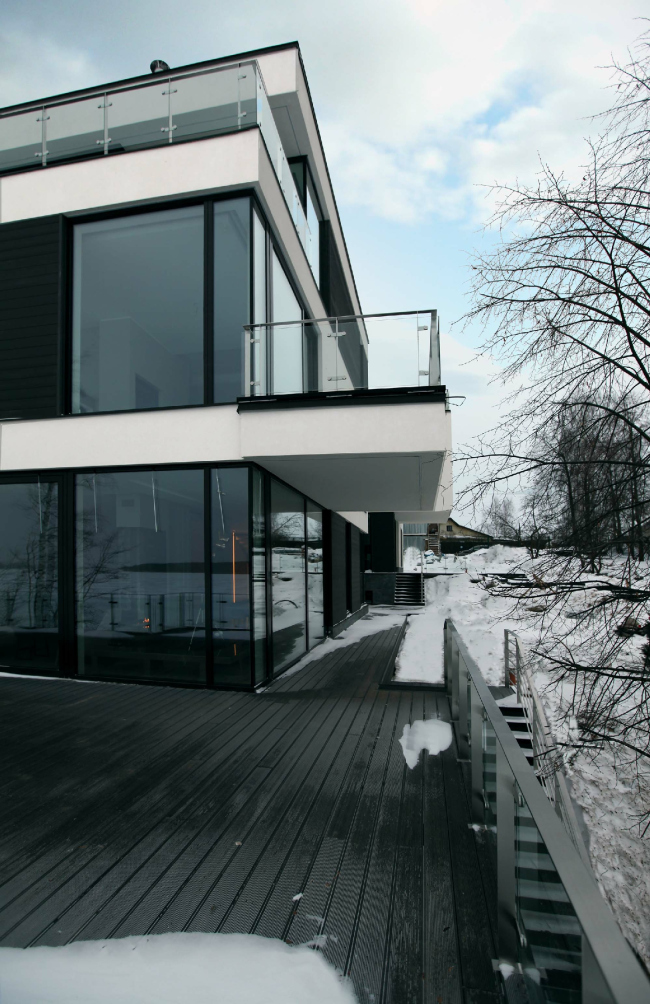 Новый дом – подчеркнуто современной архитектуры, следует заветам Корбюзье и Райта. Белые стены со вставками темных панелей древесно-полимерного композита подчеркивают горизонтали. Консоли несколько усложняют силуэт. Панорамные окна «в пол», балконы, террасы и эксплуатируемая плоская кровля позволяют любоваться окрестностями в любых ракурсах. Безусловное достоинство участка – вид на Волгу. К реке обращен северный торец дома и хотя север – по определению не лучшая ориентация, в данном случае панорама позволяет, как поясняют авторы, созерцать и закат, и рассвет. Для чего северная стена дома в трех этажах выше цоколя стала почти полностью стеклянной. Дом на Волге © Бородавченко и партнеры