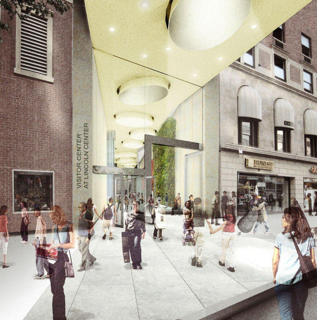 Ансамбль Центра Линкольна, включающий в себя разнообразные театры и концертные залы, в том числе – Метрополитен-оперу, и служащий «домашней сценой» многих знаменитых во всем мире трупп, построен в 1960-е годы, и среди авторов его зданий были Филип Джонсон и Эро Сааринен. К началу 2000-х годов этот комплекс культурных учреждений площадью 6,5 га обветшал, и его общественные пространства стали выглядеть малопривлекательно и потеряли популярность у горожан. В ходе архитектурного конкурса 2004 года на проект реконструкции Центра Линкольна всерьез рассматривался вариант сноса всех существующих сооружений и застройки участка с ноля. Но победившие в результате «Диллер Скофидио + Ренфро» захотели сохранить здания как памятники не только архитектурной, но и культурной жизни Америки второй половины 20 века. В рамках этой перестройки, которая должна завершиться к 2010 году, было решено создать общий информационный пункт и рекреационную зону ансамбля, которая бы также служила общественным центром для жителей соседних кварталов. Разработать его проект поручили Тоду Уилльямсу и Билли Цен, а местом для строительства выбрали «Атриум гармонии» - специфическое крытое общественное пространство площадью 650 кв. м, ведущее свою историю еще с начала 20 века. Последние десятилетия там обосновались бездомные, а также тренировались скалолазы. Но уже осенью 2009 года он должен стать важным культурным центром нового типа. По словам архитекторов, он превратится в «театральный сад», где будут слиты воедино внутреннее и внешнее пространства; там горожане и туристы смогут пообщаться, посмотреть бесплатные представления, купить билеты на любой спектакль или концерт в залах Центра Линкольна, посидеть в кафе или просто отдохнуть. Сквозь огромные «окулюсы» в перекрытиях нового сооружения внутрь будет попадать солнечный свет, сочетаясь с продуманной программой искусственного освещения. Две 6-метровые «зеленые» стены из мха, папоротников, цветущих лиан и других тропических растений будут сочетаться с каскадными фонтанами. Рядом будут установлены скамьи из зеленого мрамора, кресла и столики разного размера для отдыха посетителей. «Медиа-стена» длиной 12 м станет визуальным центром нового пространства. На ее поверхность будут проецировать архивные кадры, оригинальные мультимедийные проекты, такую полезную информацию, как расписание спектаклей и т. д. Уилльямс и Цен постарались придать новому посетительскому центру ощущение «достоинства и постоянства», что должно соответствовать его роли «преддверия» Центра Линкольна.Посетительский центр Центра исполнительских искусств Линкольна