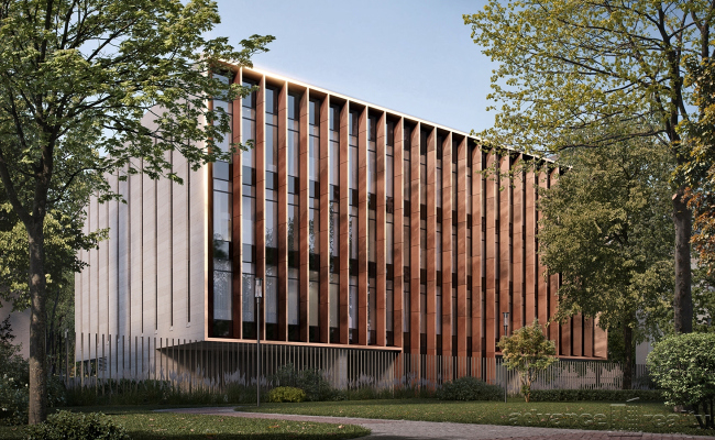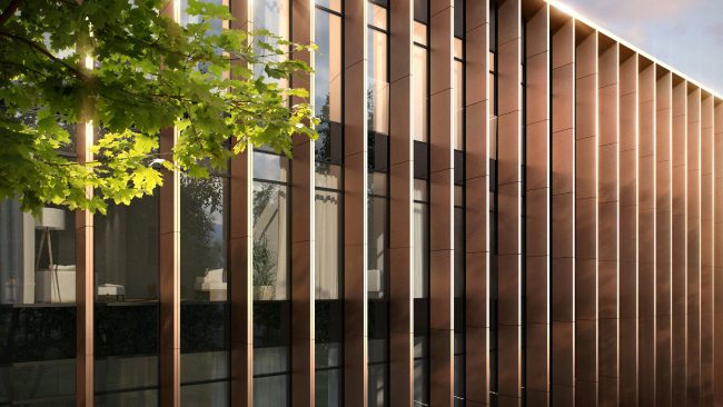 Вся роскошь архитектуры – в фасадах. Восточный фасад, обращенный к парку, наиболее открытый. Большие панорамные окна Schuco, установленные во всех жилых помещениях, обеспечивают максимальный обзор. А для защиты от солнца и взглядов извне предусмотрены широкие вертикальные ламели, отделанные медью. Торцы, выходящие к соседним домам, практически глухие. Их прорезают лишь тонкие вертикальные ленты остекления.